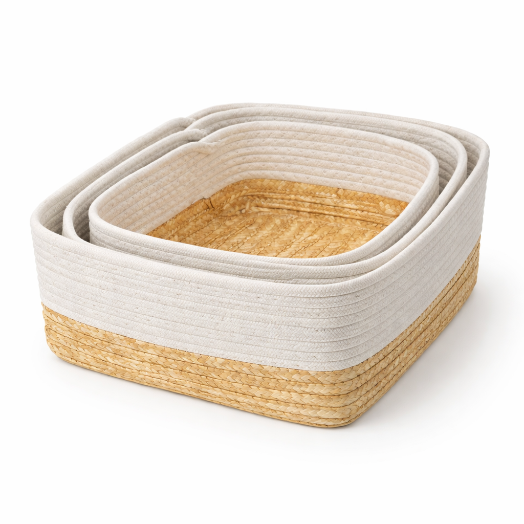 Set de 3 Canastas Organizadoras Rectangulares Tejidas Multiusos Blanco y Fibra Natural Yoyoso