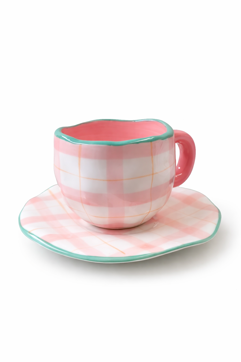 Taza de Café con Plato Diseño Cuadros Rosa y Verde 250 ml Yoyoso