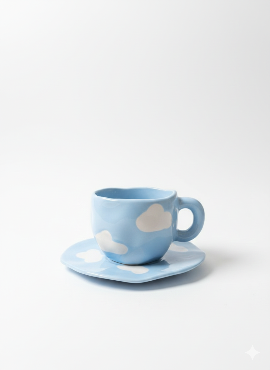 Set de Taza y Plato de Cerámica Diseño Artesanal de Nubes de 250ml Yoyoso