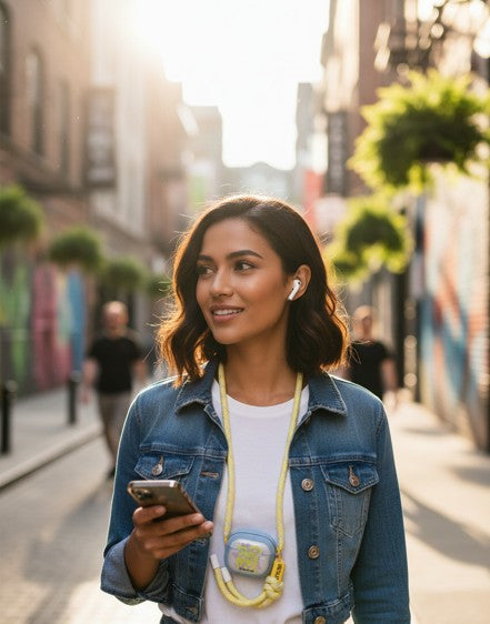 Lanyard "Stylish" Incluido: Olvida perder tus auriculares. La correa de cuerda amarilla trenzada permite llevarlos colgados al cuello de forma segura y cómoda.