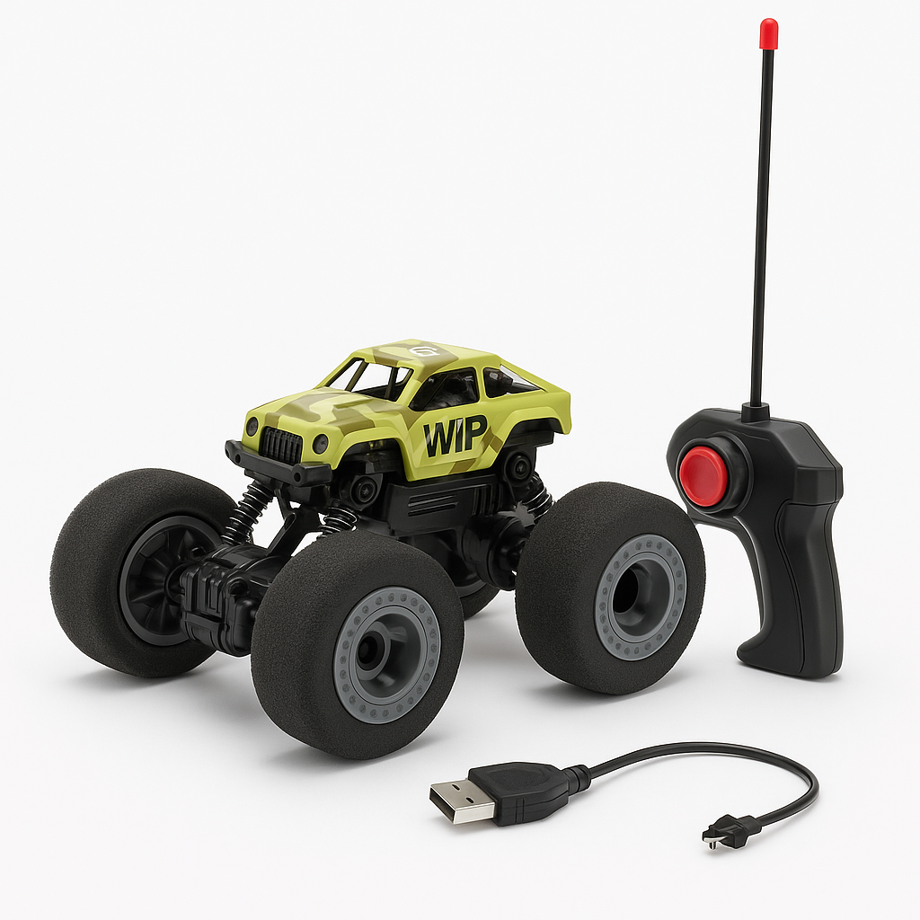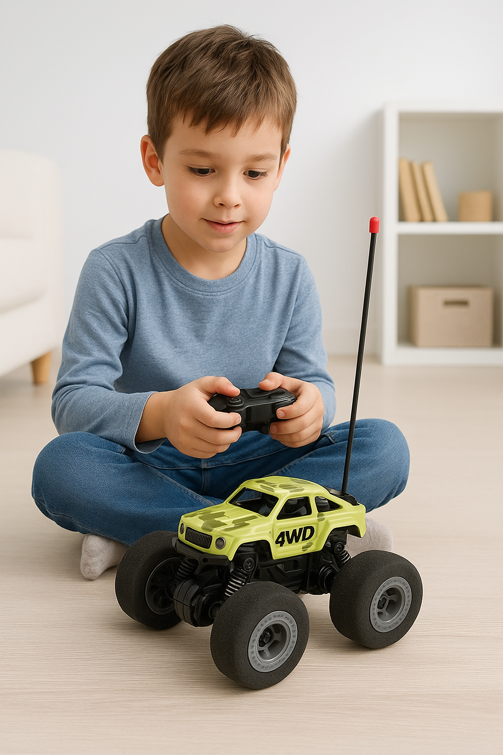 Carro a control remoto con diseño todoterreno y tracción 4x4. Su estructura resistente y ruedas de espuma permiten acrobacias, giros y subidas con gran estabilidad. Ideal para niños que disfrutan la velocidad y el movimiento.