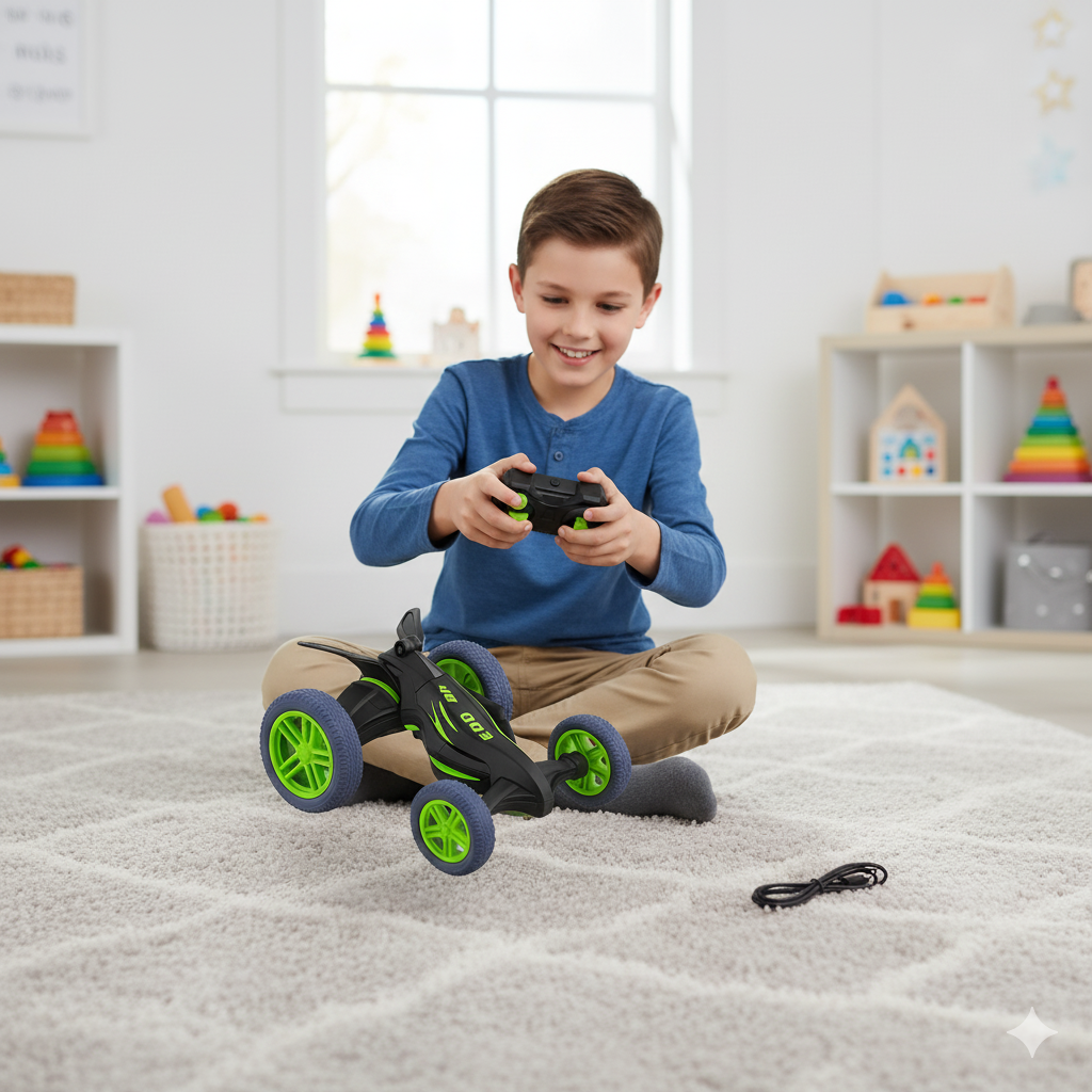 El Carro Acrobático de Control Remoto 360° ofrece diversión y velocidad en cada movimiento. Su diseño resistente con ruedas de alto agarre permite giros, volteretas y acrobacias extremas en cualquier superficie. Ideal para niños curiosos que disfrutan la aventura y la tecnología. Su sistema recargable y control inalámbrico hacen que el juego sea más práctico y duradero.