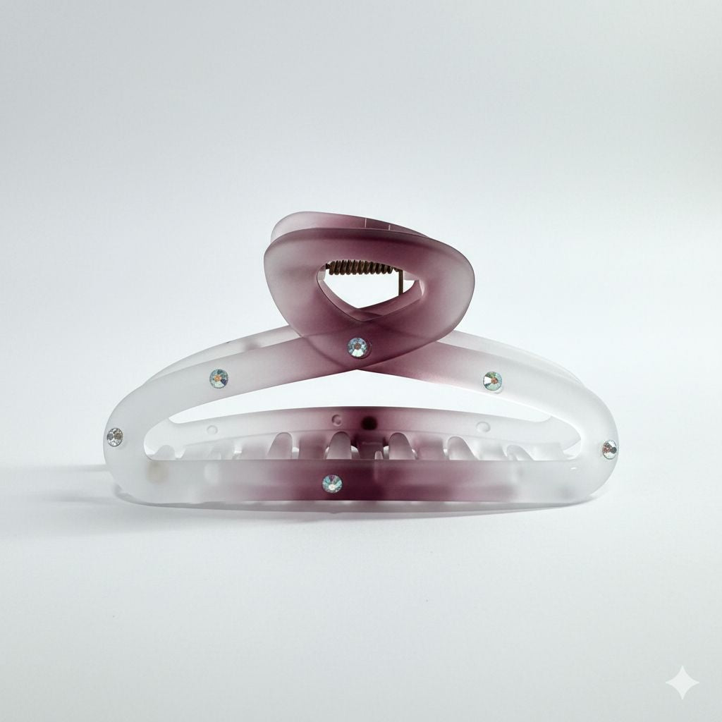 Dale un giro contemporáneo a tu peinado con la Pinza para el Cabello Aura Mist. Este accesorio destaca por su innovador diseño de líneas cruzadas y su exquisito acabado en degradado que transita de un blanco traslúcido a un profundo violeta amatista. Es la pieza clave para quienes desean mantener su cabello recogido con seguridad sin perder el estilo minimalista y refinado.