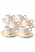 Este set de 6 tazas con plato destaca por su sofisticado diseño con acabado iridiscente que emula el brillo de las perlas y las conchas de mar. Cada pieza ha sido cuidadosamente diseñada con un asa decorativa formada por esferas que aportan un toque de lujo y refinamiento a tu mesa.