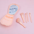 Lleva tu rutina de belleza a todas partes con este encantador kit de brochas de viaje. Protegidas por un elegante estuche rígido en forma de concha de mar, estas 5 brochas esenciales incluyen un espejo integrado para facilitar tus retoques en cualquier momento. Su diseño compacto y cerdas suaves lo convierten en el accesorio perfecto para tu bolso o maleta.