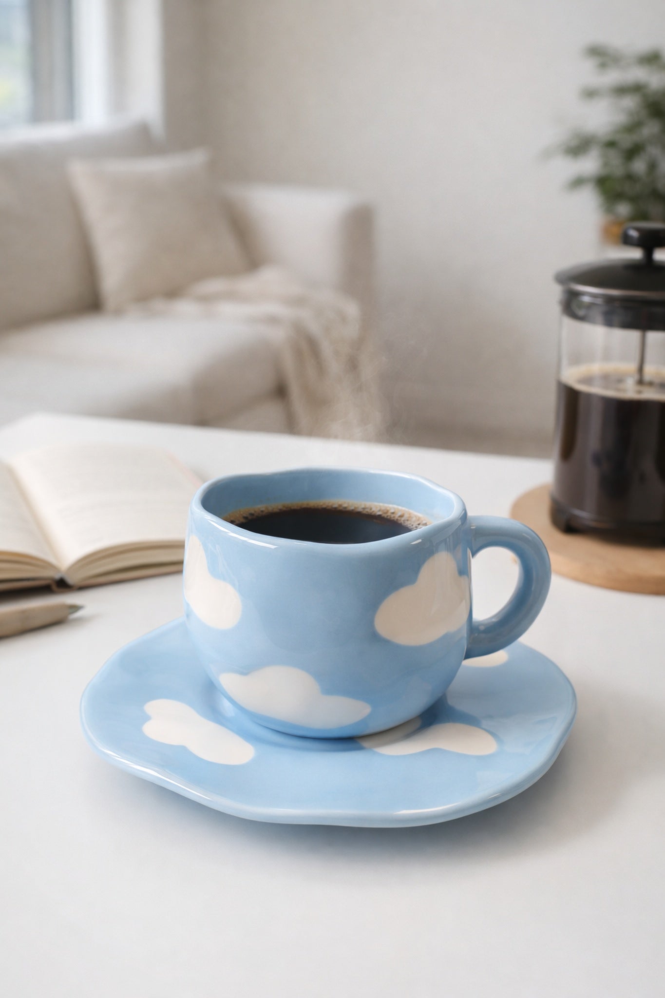 Añade un toque de serenidad a tus mañanas con este set de taza y plato de cerámica con diseño de nubes. Su estética soñadora, que combina un suave color azul cielo con nubes blancas, presenta una forma artesanal con bordes irregulares orgánicos y un acabado brillante que ofrece una experiencia visual única.